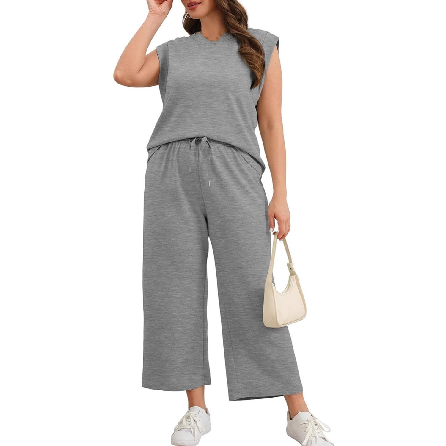 Dámský dvoudílný komplet s topem s krátkým rukávem, širokými nohavicemi, zkrácenou délkou, tvarovaným zadním dílem pro co nejlepší vzhled zezadu a elastickým pasem.
